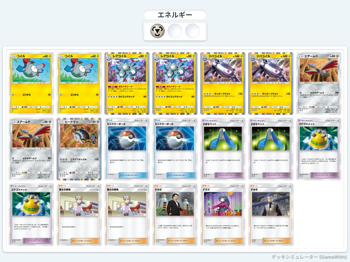 このデッキの弱みはデッキの自由度がかなり低いところでしょうか。ジバコイルセットで6枚、エアームドとマントとゴツメは2枚ずつ採用必須、博士とモンスターボールも確定しているとして残り4枠しか残っていませんね。