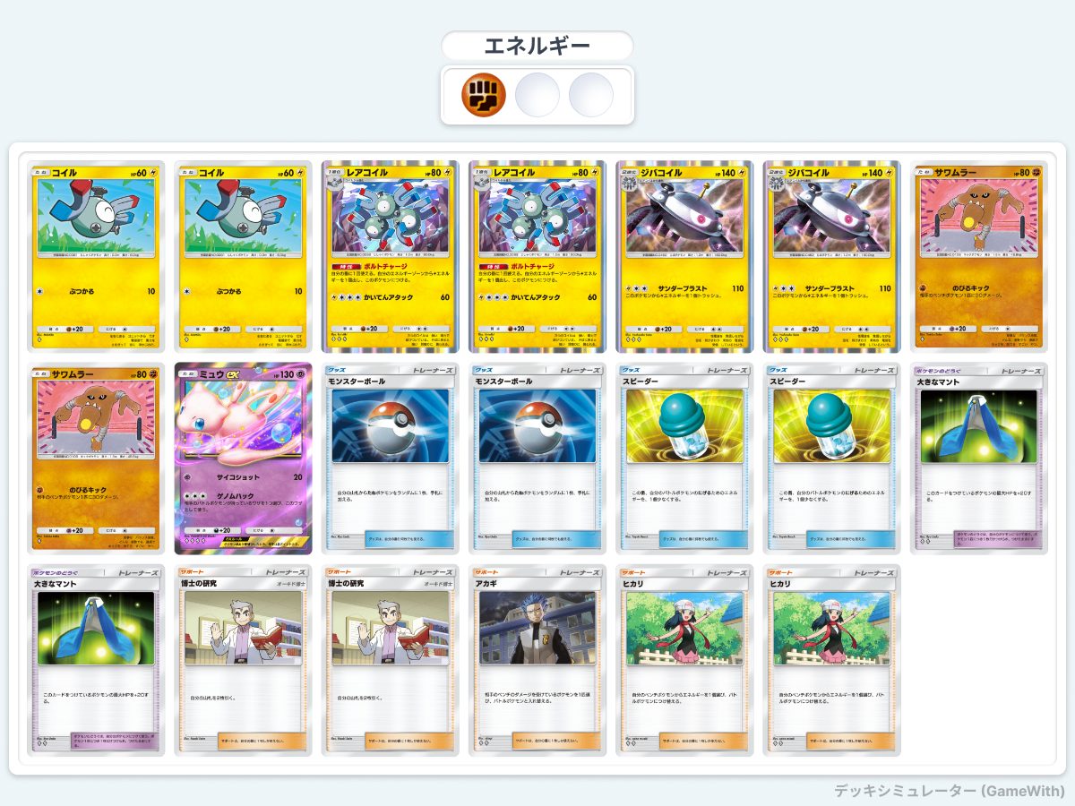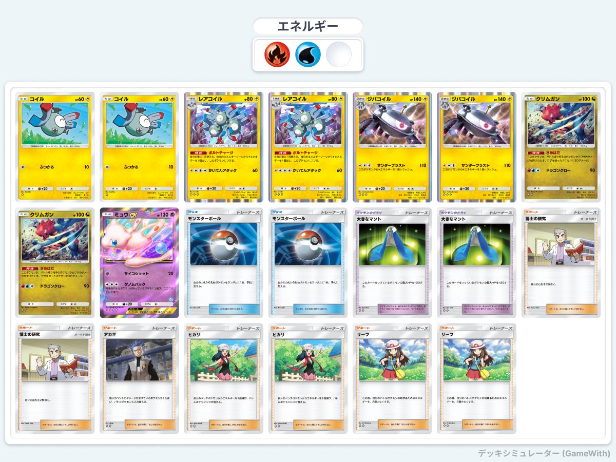 裏で成長するジバコイルと前で意気揚々と戦うクリムガン、一部のポケモンをふっとばすために保険として入っているミュウexが完璧なシナジーです。