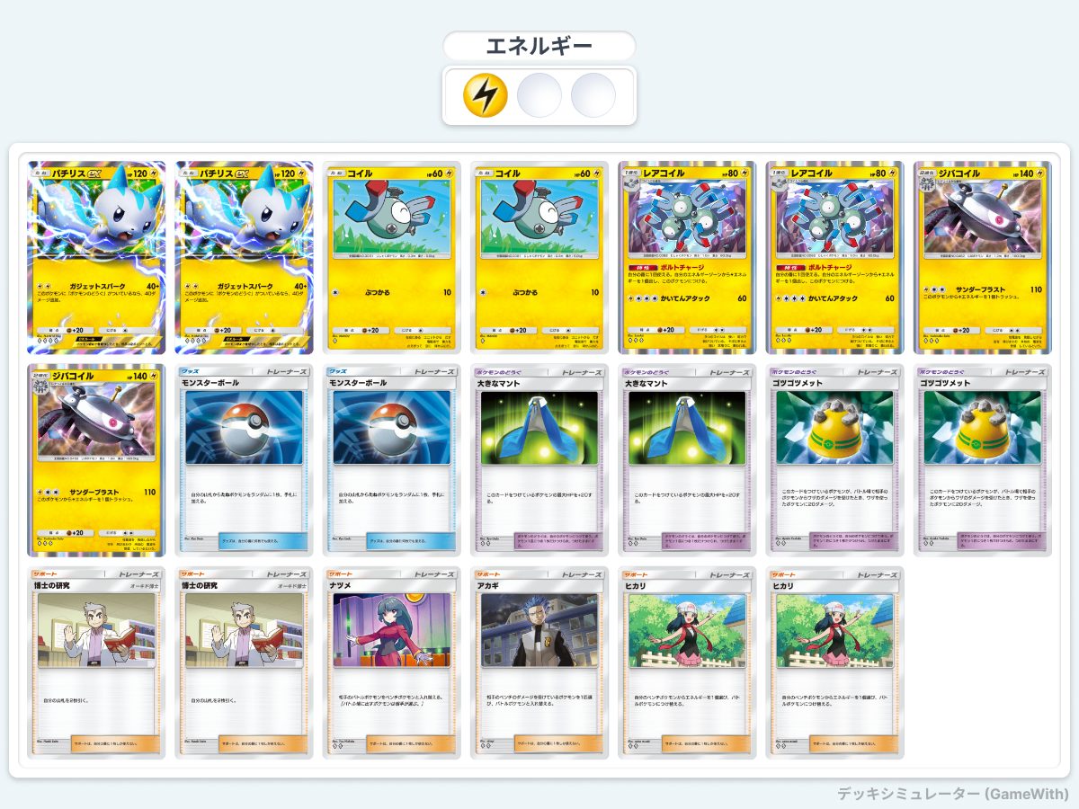 コイル(1ターン目必須)、レアコイル、パチリス、ヒカリ、どうぐ