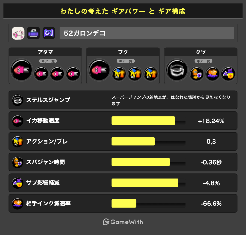 .52ガロンにおすすめギア構成は、画像の通りで、ステルスジャンプでの前線復帰を前提とし、イカ速を多く詰んだ構成となっています。