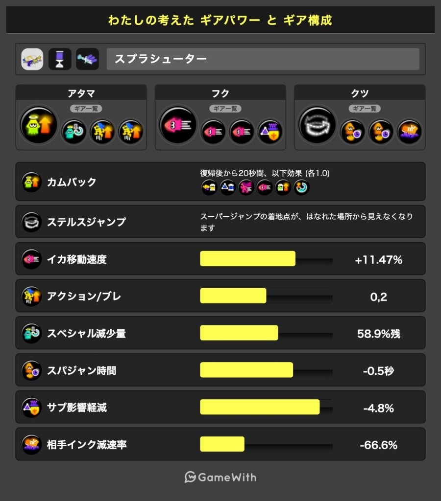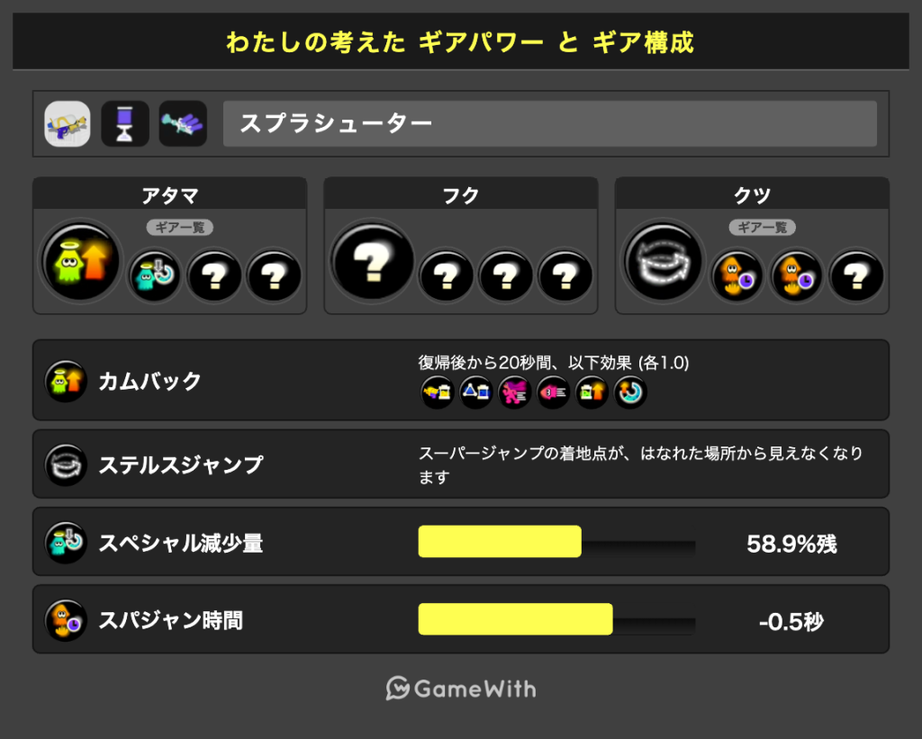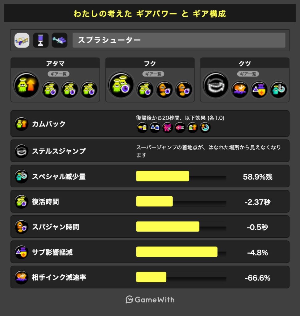 カムバ快適ステジャンとは画像のようなカムバック+ステルスジャンプ+快適ギアモリモリの構成です(画像はイカ速型)